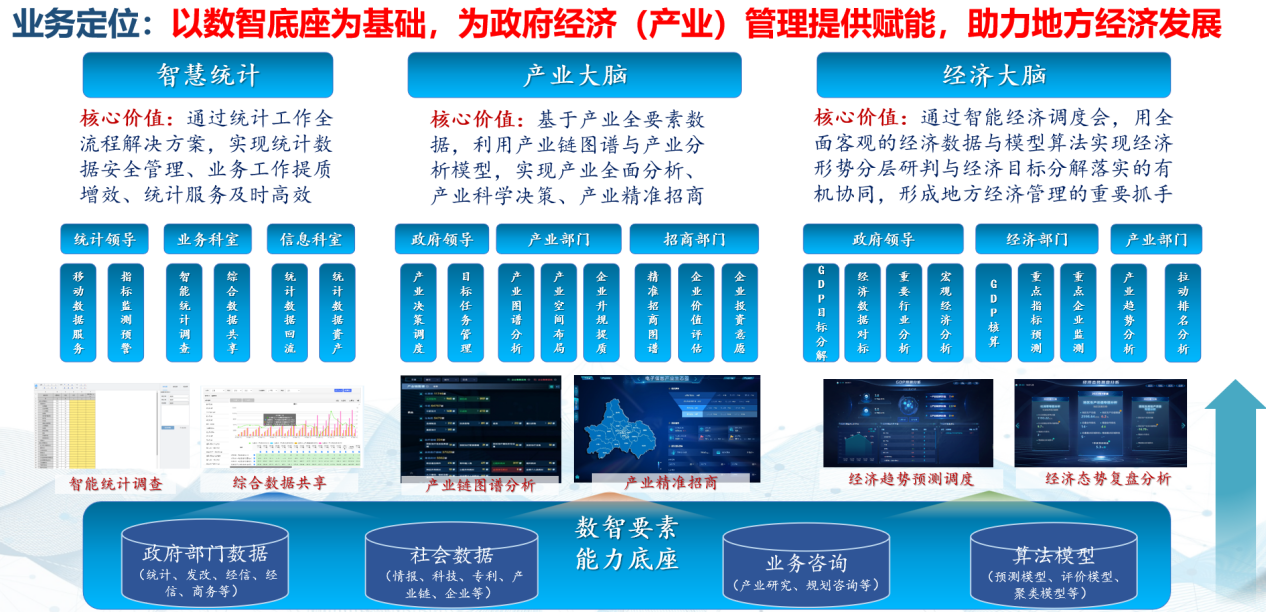 為充分發揮數字化在政府履行經濟調節的重要支撐作用,強化經濟運行大數據監測分析,提升經濟調節能力,中科信息公司以“數據智能”驅動政府產業與經濟治理的數字化改革,基于自身在產業經濟領域的行業經驗、技術積累及數據沉淀,構建宏觀“看形勢”“測趨勢”,中觀“析堵點”,微觀“治問題”三層應用,打造“經濟大腦”、“產業大腦”、“智慧統計”全鏈條產品解決方案,成為地方政府做好經濟治理、產業發展的有力抓手