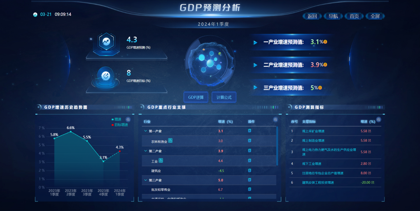 按照GDP核算體系結合相關內置的科學模型,針對下個周期的經濟運行走勢(重點經濟指標)進行預測及研判,并通過經濟運行智慧調度平臺對初步的走勢結果進行調度分析與目標任務的分解下發,真正實現經濟調度“智能化”。
