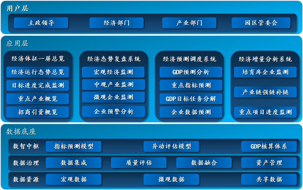 強化目標導向,對海量宏觀經濟數據進行整合,通過模塊化、可視化、智能化的手段,構建起宏觀經濟監測、分析的指標體系,全面分析地方經濟發展情況。